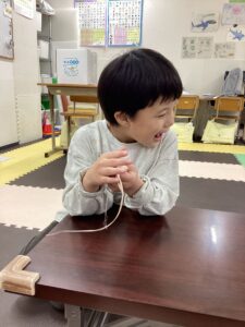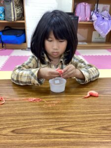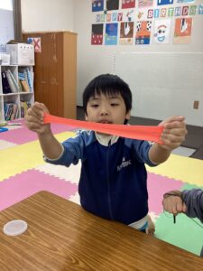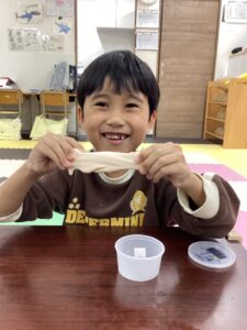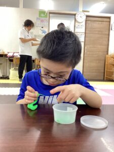 セラパテあそび】セラパテとは、トレーニング用シリコンパテのことで「握る」「伸ばす」「ちぎる」などの手指訓練を通じて、手の感覚の発達を促す事を目的に活動をしています。