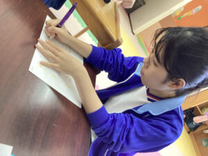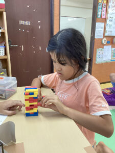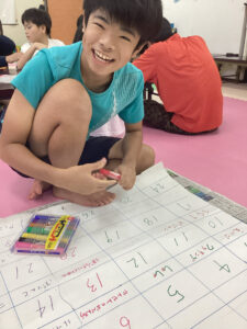 先生が「Teacher says~」と言った時にしか動いてはいけないというルールをしっかり守って取り組んでいました。