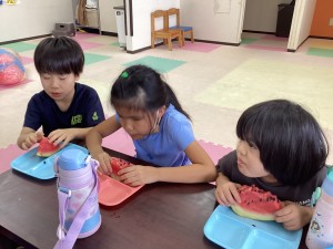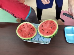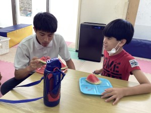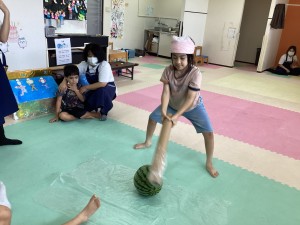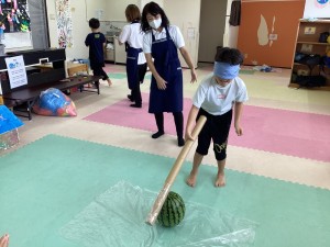 予定を変更して教室の中で楽しくスイカ割りを行いました\(^o^)/