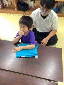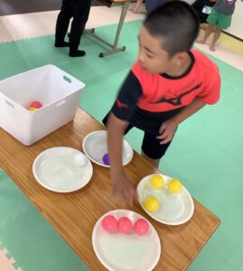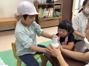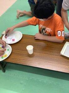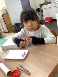 ビーズを瓶の穴に入れる手指訓練を頑張りました👏
