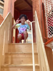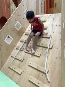 他にもロープを使って登り降りをしたり、網をはだしで渡って「足いた~い」と笑いながら言う子もいました!