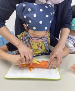 まず、キャベツを手でちぎって人参の皮を剥き、ウインナーを切ります!