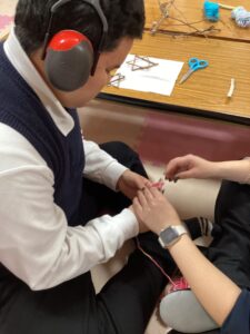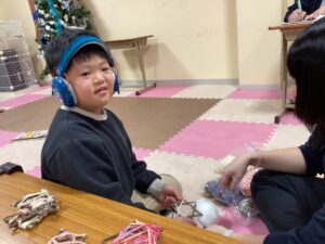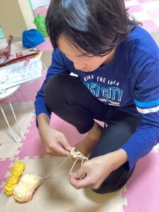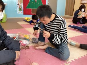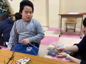 木の枝にひもを巻いてリースを作りました!