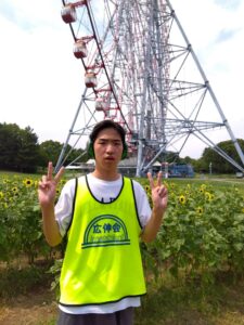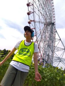 日本で2番目に大きい観覧車と、ひまわりの前で