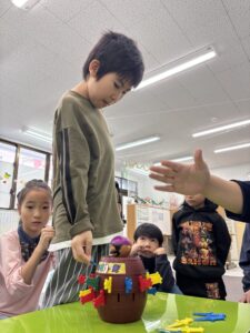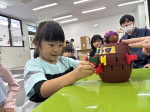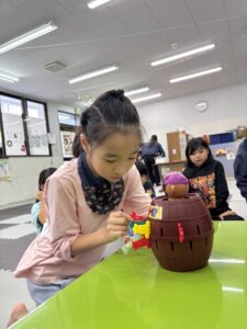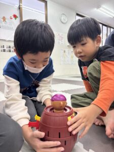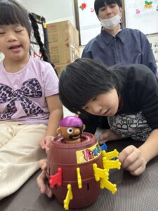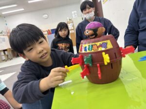 お誕生日レクでは、サンタさんからもらった黒ひげ危機一髪をして