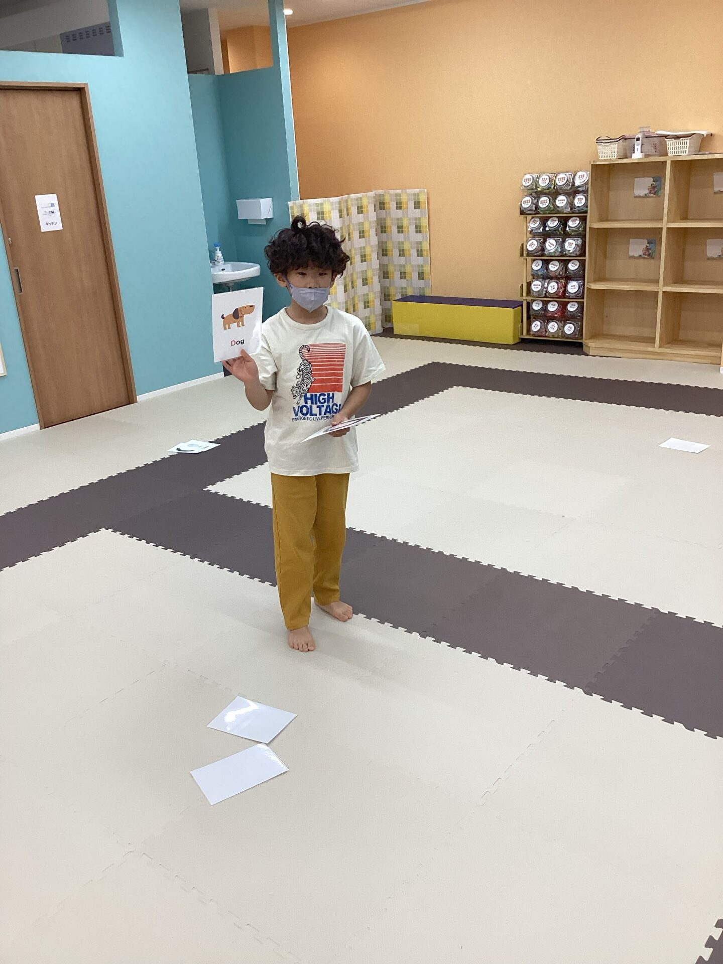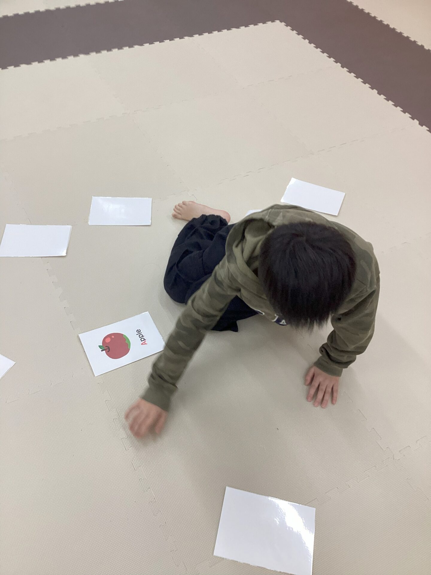 職員が「Apple!」「Dog!」などの英単語を読み上げると、子どもたちは真剣な表情でカードを探し、見つけると「あった!」と嬉しそうに取っていました✨