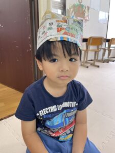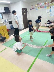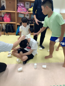 チームにわかれてお友達に紙コップを乗せ、一番多く乗せた方の勝ち✨