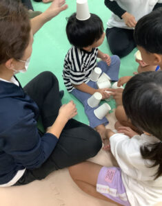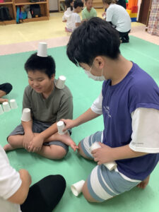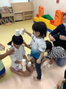 チームにわかれてお友達に紙コップを乗せ、一番多く乗せた方の勝ち✨
