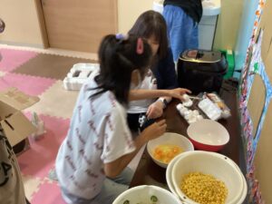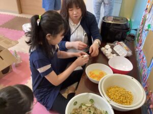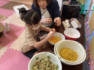 キャベツをもんだり、卵を割ったり、みんなで協力して作りました(*^^*)