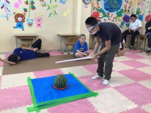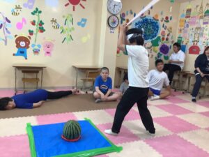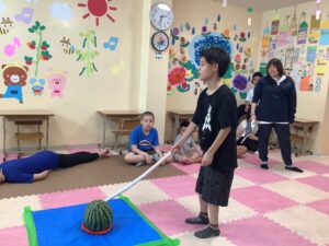 目隠しをしてクルクル回ったあと、お友達の声を頼りにスイカを目指して一歩ずつ前進…。