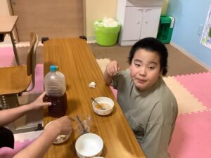 今年の夏休みも暑くてあまり公園では遊べませんでしたが、合同夏祭りや外食体験、お買い物体験など室内で楽しく過ごすことができました!