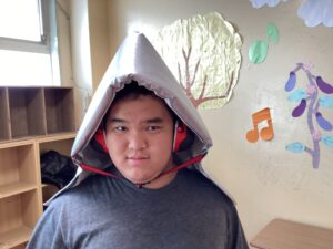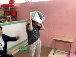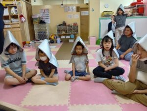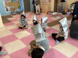 なぜ防災頭巾が必要なのか、職員の説明をよく聞いて被る練習をしました(^^)
