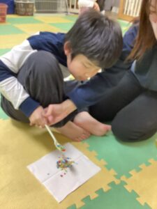 2チームに分かれ、サンタとトナカイの絵が貼られたブロックマットをひっくり返し、どちらが多く上を向いているかを競いました(´艸`*)先生と子どもチームに分かれて勝負!!