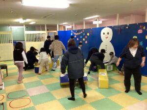 子どもたちに色塗りしてもらった炭治郎と禰豆子の絵をブロックマットに貼り、先生と子どもチームに分かれて勝負しました(^^)/