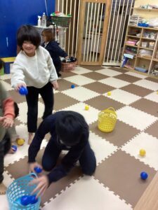ボールをひなあられに見立てて、かごと同じ色に分けてもらいました!
